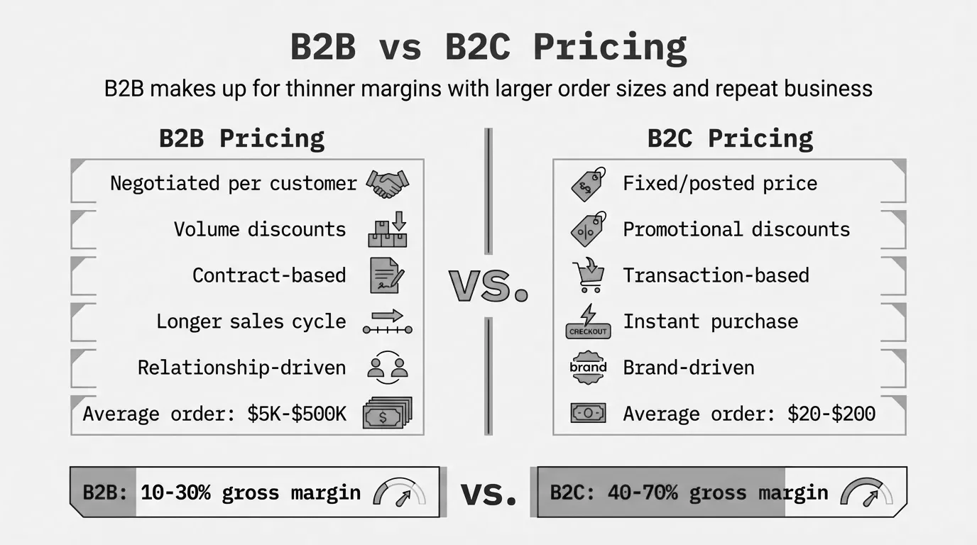 B2C prices are public by default. A consumer can pull up five browser tabs and compare prices in under a minute. This transparency forces B2C companies into tight competitive bands. You can't charge 30% more for the same commodity without a strong brand story.