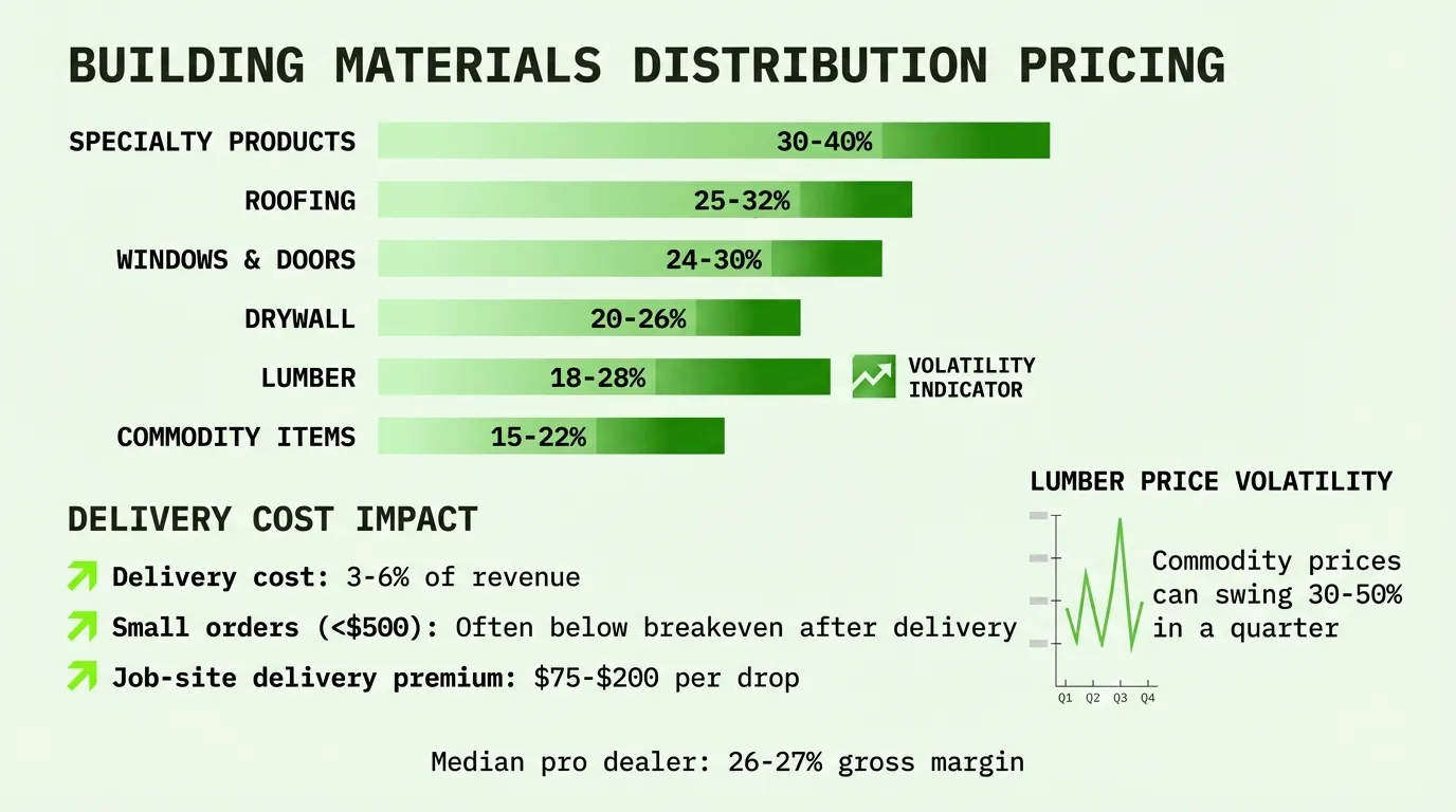 Building materials margins vary dramatically by product type. Commodity products carry thin margins and high volatility. Specialty products carry better margins but move slower.