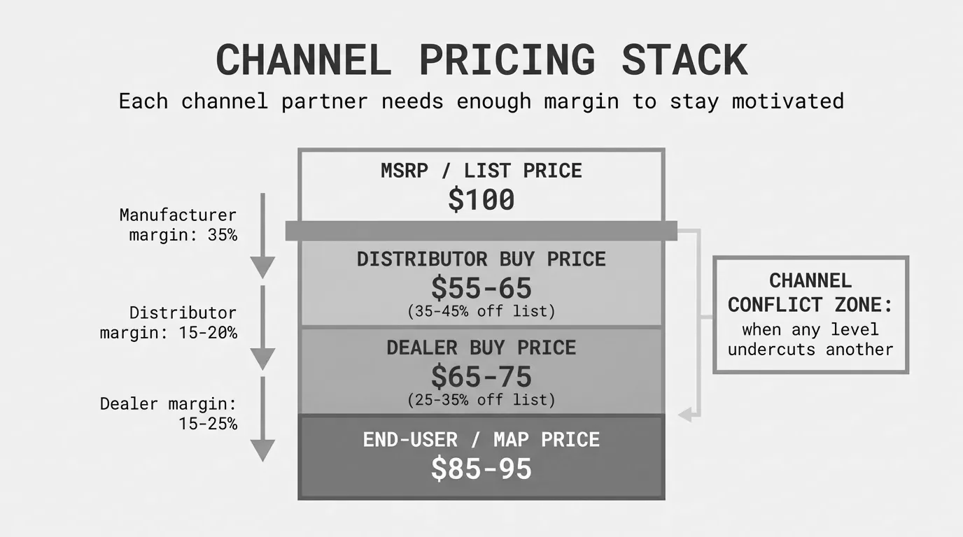 If you want a $60 pocket price and your total channel discount (across all tiers) averages 40%, your list price needs to be $100. Simple math, but most manufacturers set list price based on cost-plus logic and then try to back into channel discounts. That's backwards.
