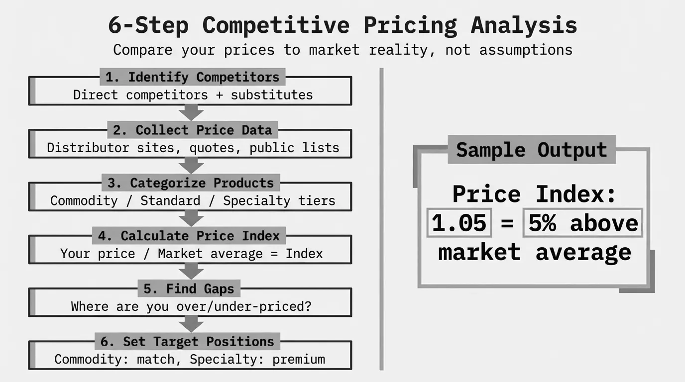 That's what a competitive pricing analysis actually does. It replaces "I think we're too expensive" with "we're 7% above market on commodity fasteners and 6% below market on specialty fittings." One of those is a problem. The other is an opportunity. Without the analysis, they look the same. For a deeper look at the pricing methodology behind these decisions, start there.