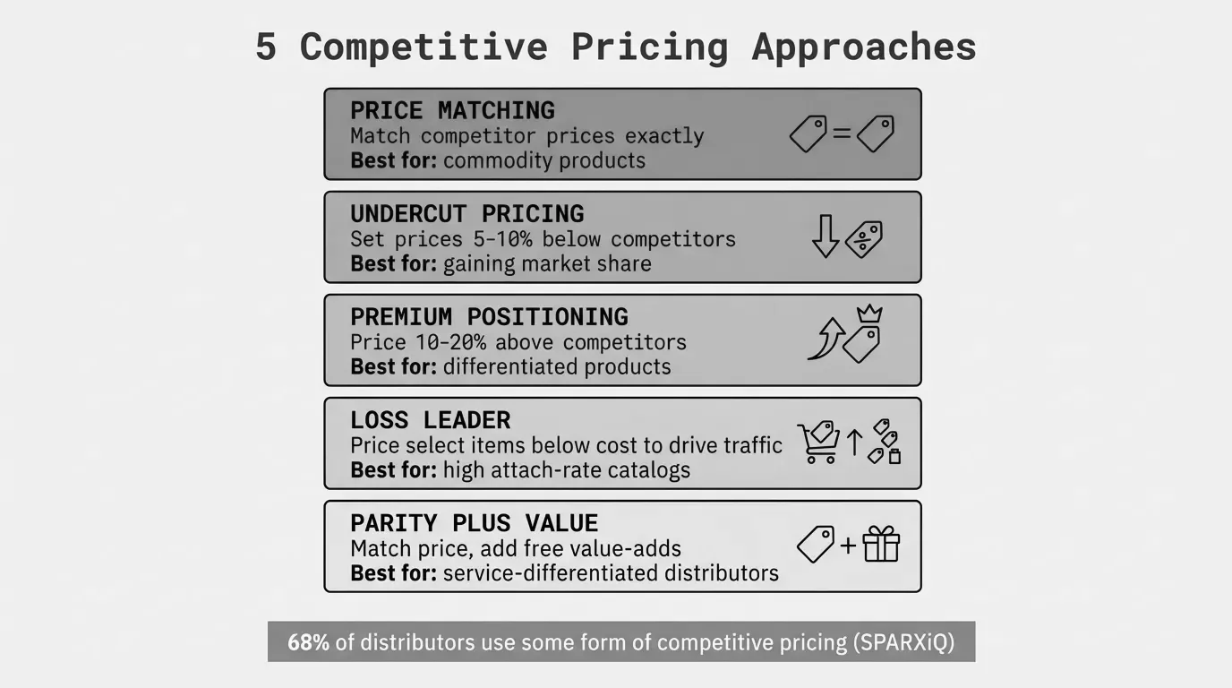 Competitive pricing means setting your price based on what competitors charge. Sounds simple. But the gap between "we looked at competitor prices" and "we built a systematic competitive pricing approach" is worth 3-7 points of gross margin for a typical $50M-$150M distributor.