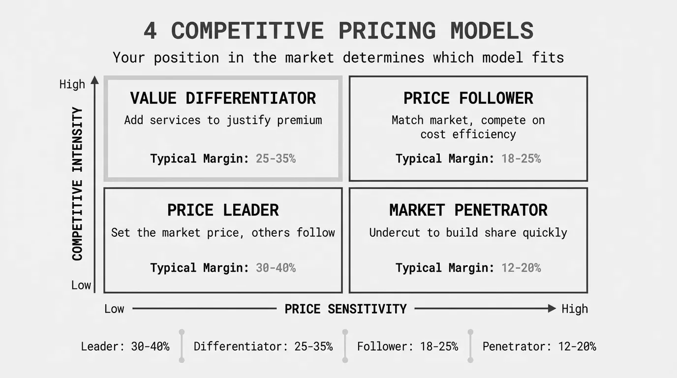 This article covers five competitive pricing models, when each one works, the margin expectations that come with it, and how to pick the right one for your business. For broader context on how competitive pricing fits into your overall approach, see the competitive pricing guide.