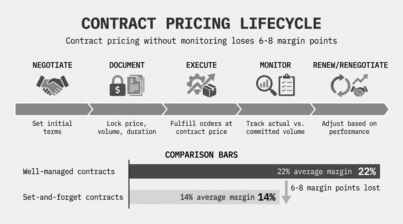 Contract pricing is a pre-agreed rate between a buyer and seller that holds for a defined period, typically 12 to 36 months. It's the backbone of B2B distribution and manufacturing transactions. And it's one of the most common places mid-market companies bleed margin without realizing it.