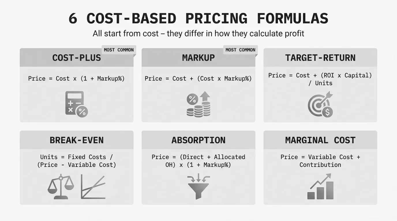 There are six distinct cost-based formulas. Each starts from cost, but they differ in which costs they include, how they calculate the profit component, and what business question they answer. The most common is cost-plus pricing, but it's not the only option, and using the wrong formula for the situation leaves money on the table.