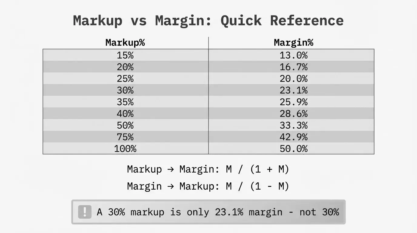 The confusion compounds because markup and margin percentages don't move at the same rate. A 50% markup gives you a 33.3% margin. Double the markup to 100% and your margin only reaches 50%, not 100%. The relationship isn't linear, which is why a conversion table matters.