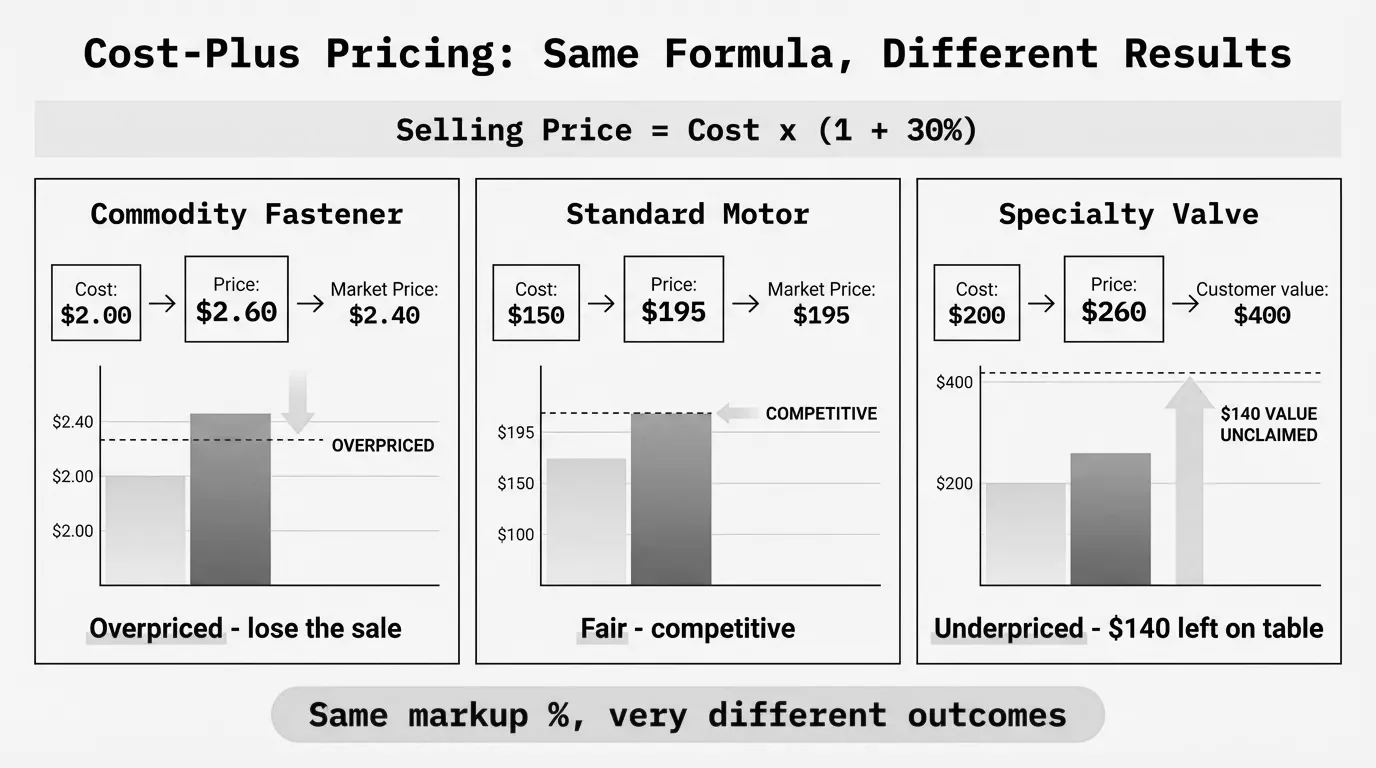 But "straightforward" doesn't mean "optimal." After six years of pricing work with distributors and manufacturers, I've seen the same pattern: companies default to cost-plus because it's simple, then wonder why margins erode year after year. The problem isn't the formula. It's applying it uniformly across 10,000+ SKUs without thinking about what each product is actually worth to the customer.