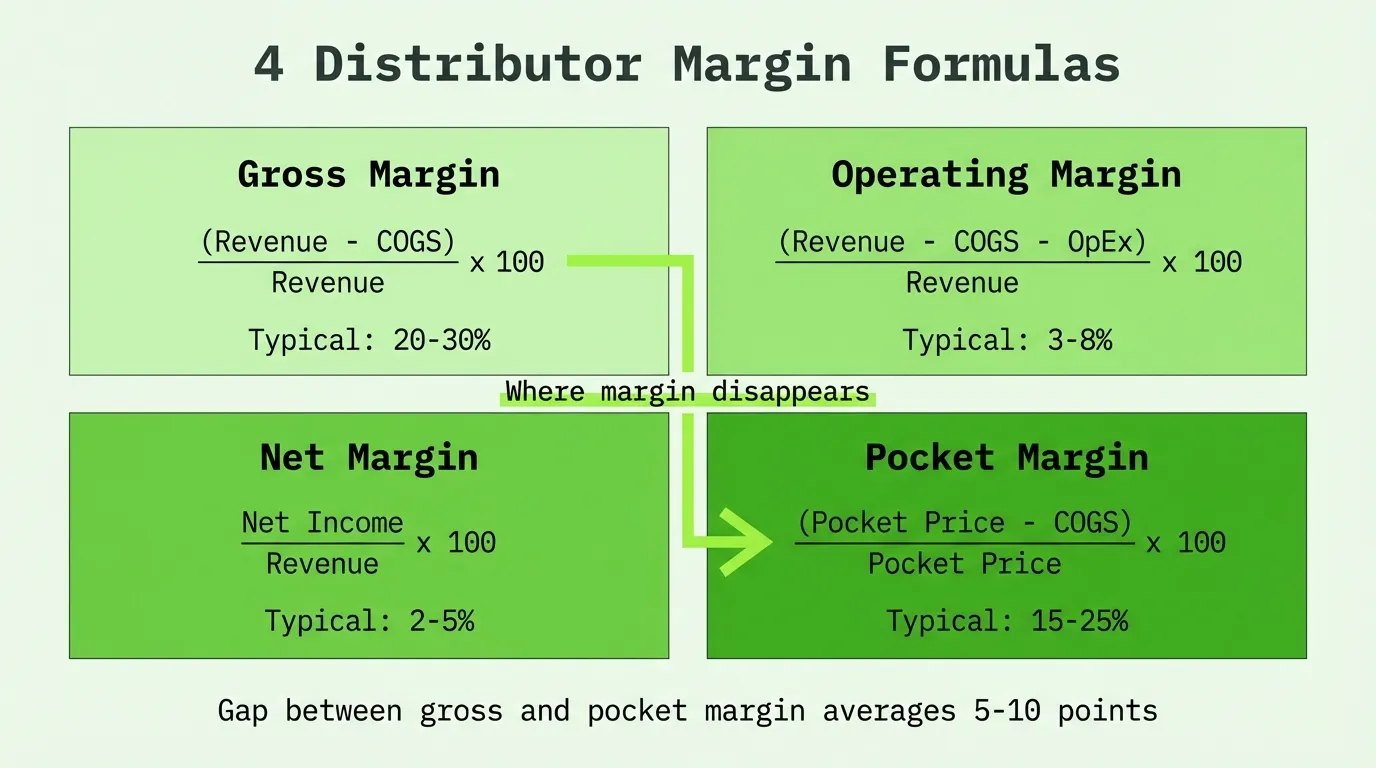 There are four margin formulas that matter in distribution: gross, operating, net, and pocket. Each one strips away another layer of cost to show you a different picture of profitability.
