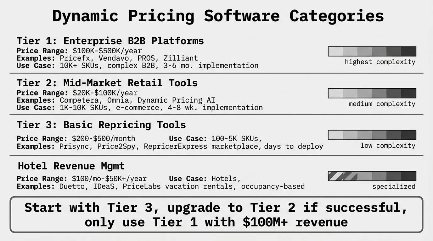 The software market divides into clear categories: enterprise platforms for complex B2B distribution ($100K-$500K annually), mid-market tools for retail and e-commerce ($20K-$100K annually), and basic repricing software for small catalogs ($200-$500/month).