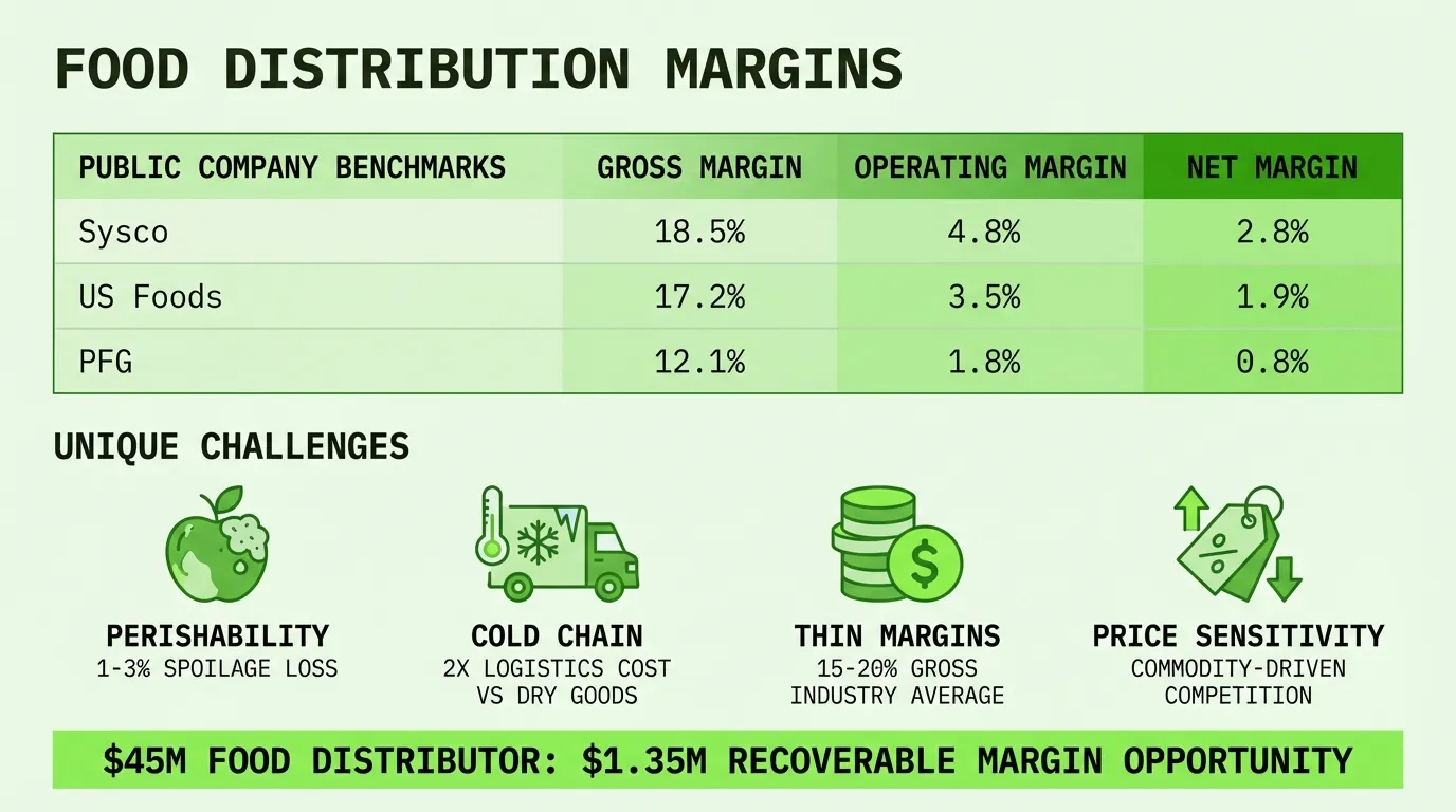 Food distribution is the thinnest-margin sector in wholesale distribution. Gross margins run 15-20%. Net margins sit at 1-3%. A single bad week of spoilage or a pricing error on a large account can wipe out a month's profit.