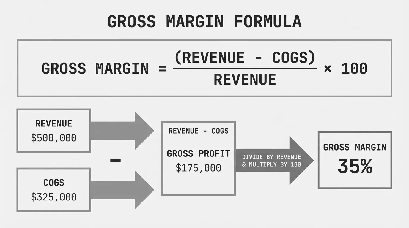 Gross Margin % = (Revenue - Cost of Goods Sold) / Revenue × 100This single number reveals how efficiently you convert sales into profit before operating expenses. A 35% gross margin means you keep $0.35 from every dollar of revenue after paying for the product itself.