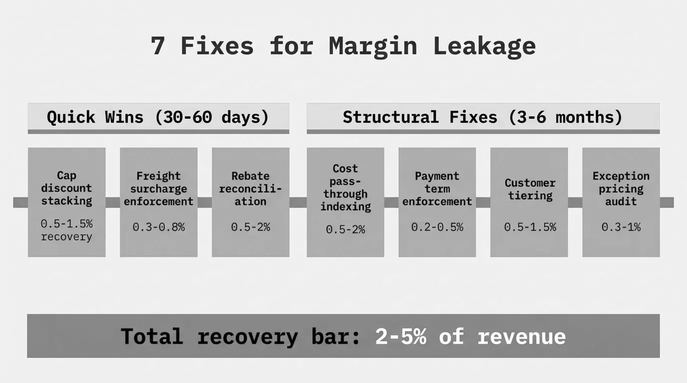 Fixing margin leakage means identifying and closing the specific pricing gaps, process failures, and policy holes that drain profit from individual transactions, then building systems that prevent them from reopening.