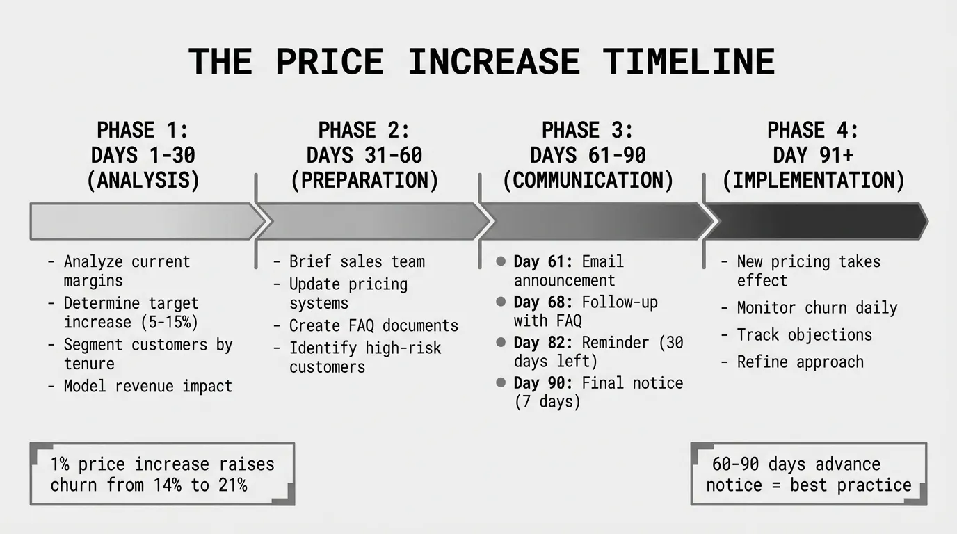 Most businesses can implement a price increase in 90 days with minimal churn if they communicate value, offer alternatives, and segment customers appropriately.