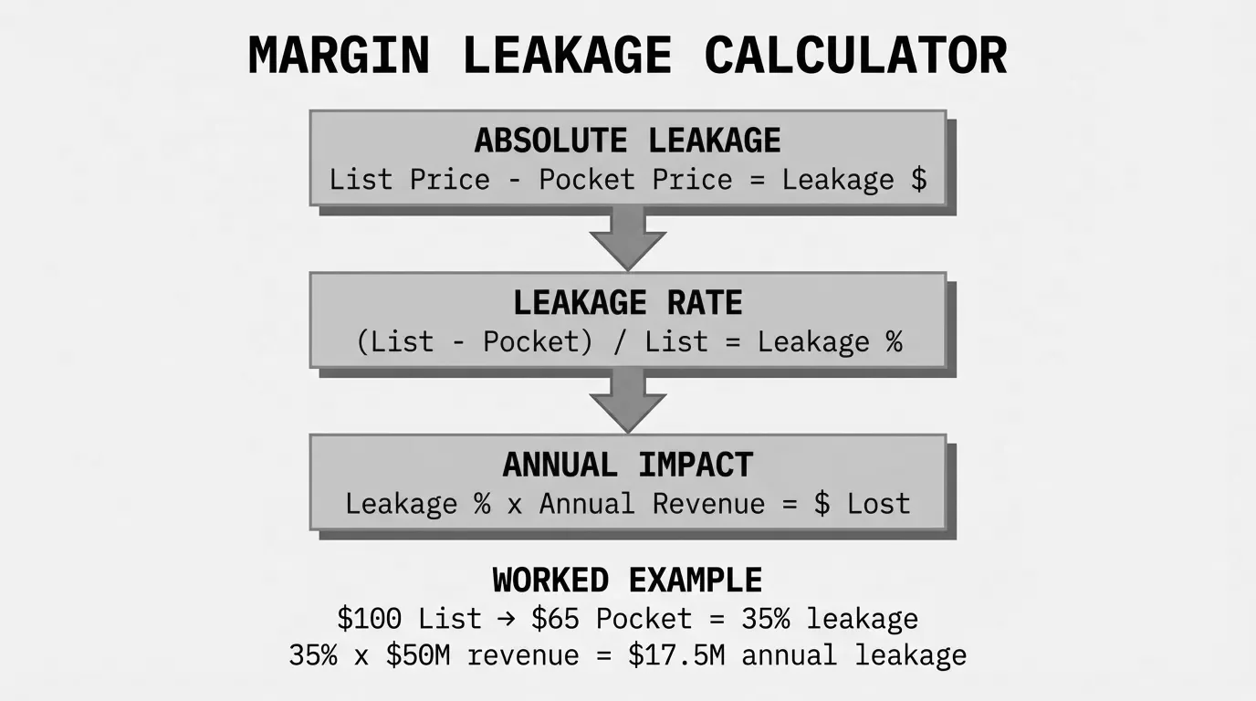 Margin Leakage ($) = List Price - Pocket PriceThe pocket price is your invoice price minus all off-invoice deductions: freight absorbed, rebates paid, early payment discounts, returns, allowances, and any other post-sale costs. The leakage rate is this dollar amount divided by the list price, expressed as a percentage.