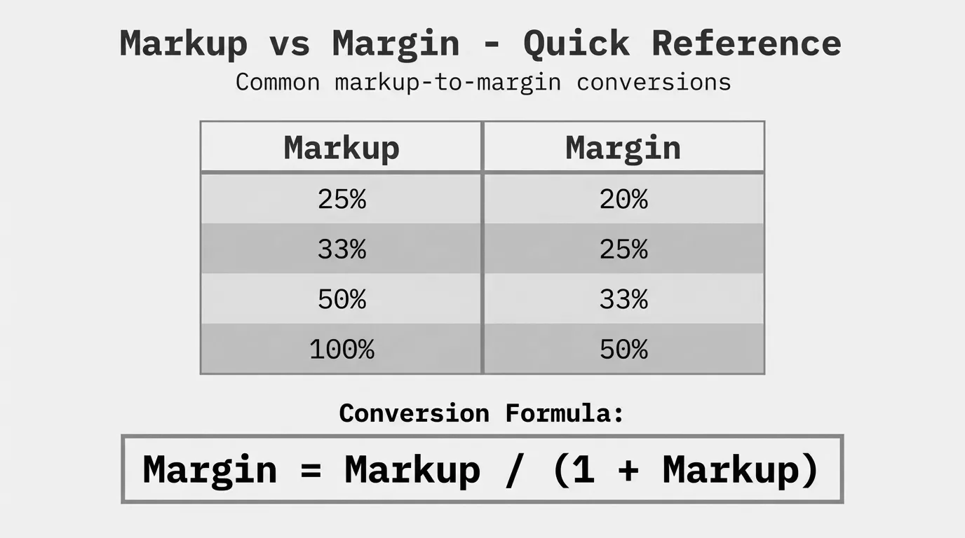 Convert markup percentage to margin percentage with formulas and a conversion table. Learn why 50% markup equals only 33.3% margin.