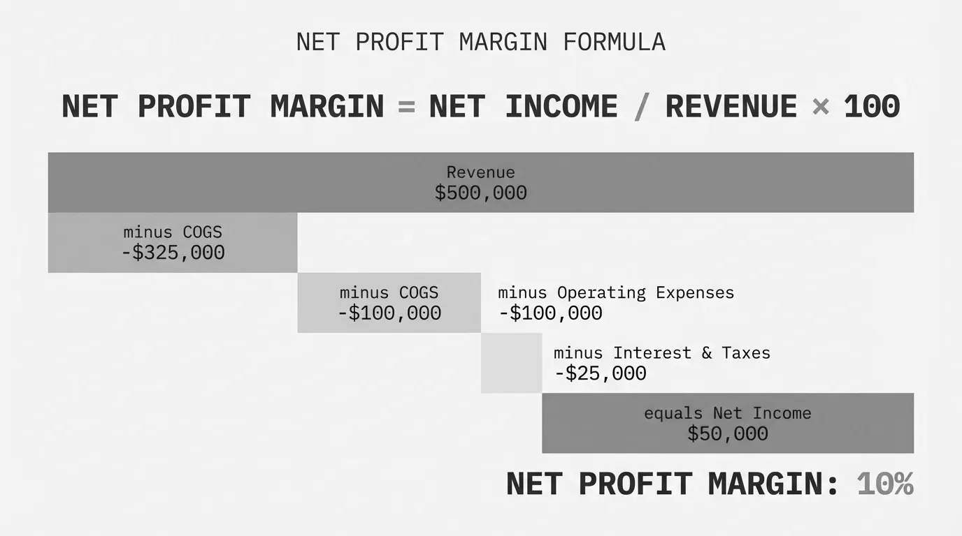 Net Profit Margin = (Net Profit / Revenue) x 100This is the bottom line profitability metric. Unlike gross margin, which only accounts for direct costs, net margin includes every expense your business incurs.