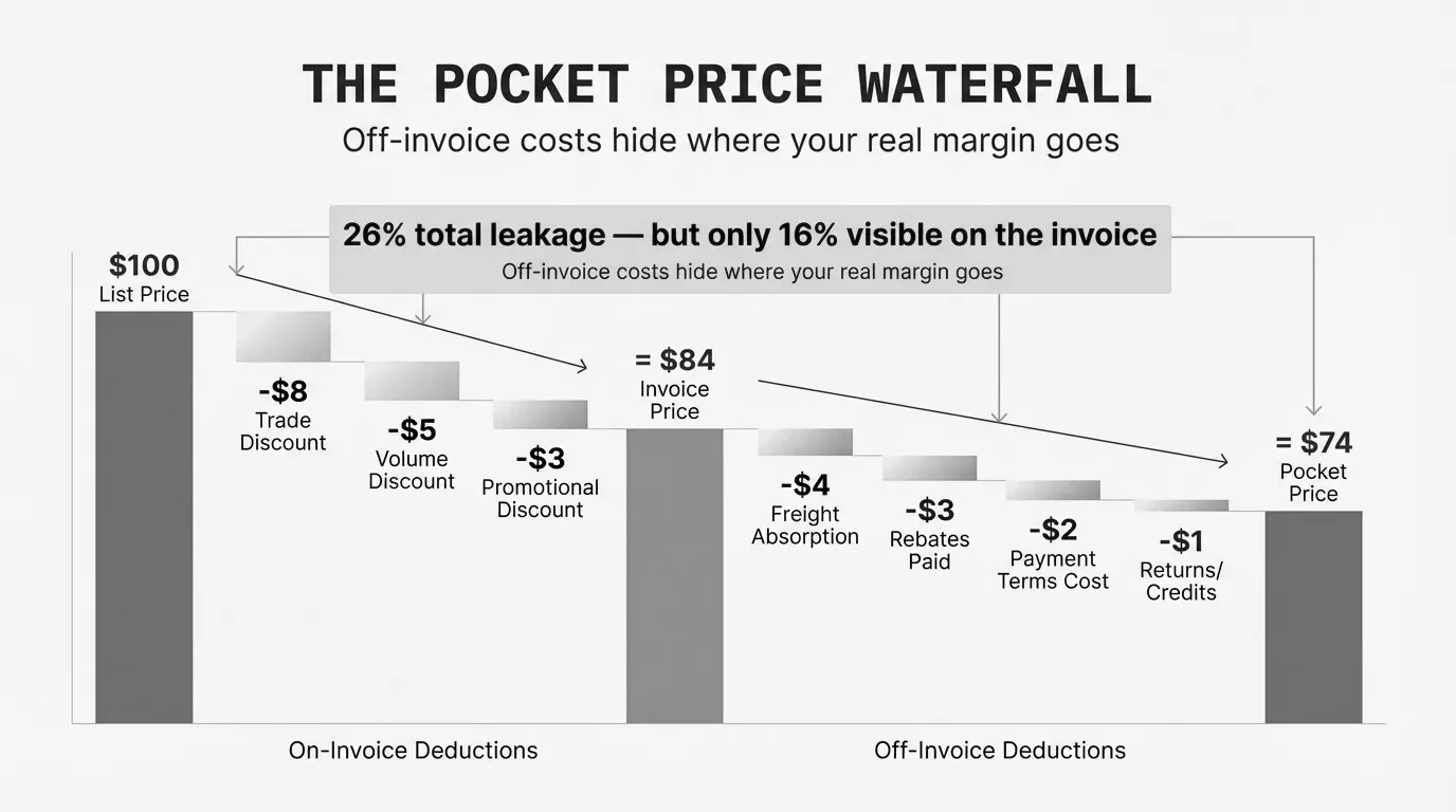 The gap between invoice price and pocket price is where margin hides. And because off-invoice costs don't appear on the invoice or in the order management system, most companies don't see them until someone builds a waterfall.