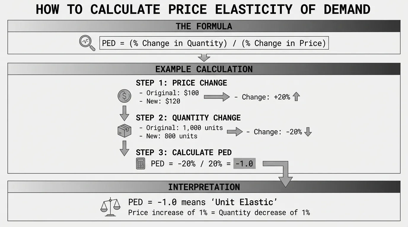 The price elasticity of demand formula is the percentage change in quantity demanded divided by the percentage change in price. It's expressed as PED = (% ΔQ) / (% ΔP). A coefficient of -2.0 means a 10% price increase causes a 20% drop in quantity demanded.