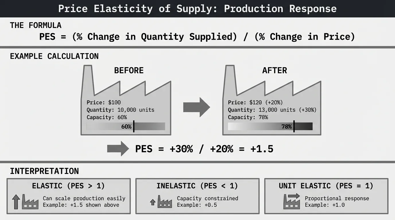 The coefficient tells you how much production capacity can flex in response to market prices. A manufacturer with elastic supply can ramp up production when prices rise. A manufacturer with inelastic supply is capacity-constrained and can't respond much to price signals.