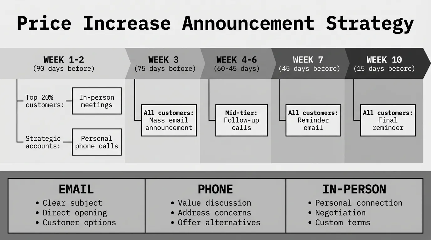 A price increase announcement is how you notify customers about upcoming pricing changes through email, letter, phone calls, or in-person meetings. The way you announce the increase determines whether you retain 85% to 95% of customers or lose 30% or more to churn.