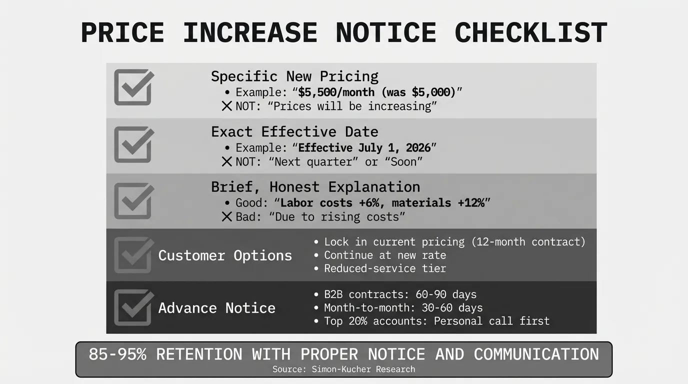Research from Simon-Kucher on B2B price increase campaigns found that companies with clear, consistent communication and adequate advance notice retain 85% to 95% of customers through price increases. Companies that surprise customers or fail to communicate value lose 30% or more.