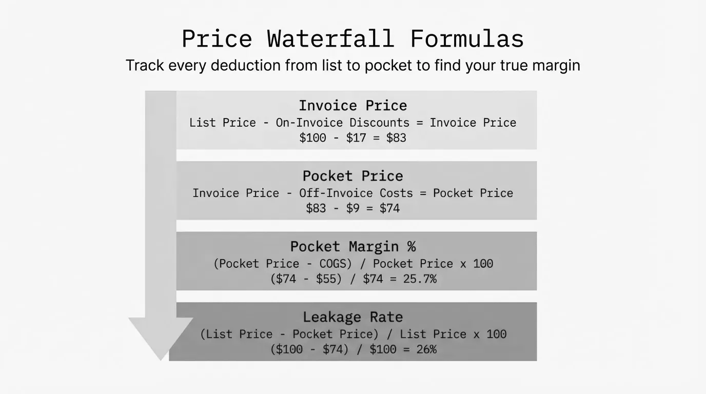 The complete price waterfall formula explained. Calculate pocket price, margin erosion, and cost-to-serve with step-by-step examples.