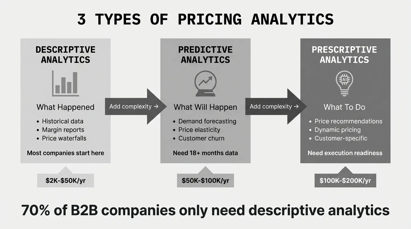 When it's sufficient: Most distributors and manufacturers start here. If you're using Excel today and haven't systematically analyzed pricing data, descriptive analytics reveals 80% of margin improvement opportunities.