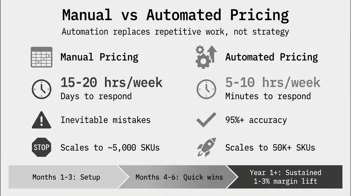 Pricing automation delivers clear ROI when you have enough pricing complexity to justify software costs—typically 5,000+ SKUs or high-velocity price changes.