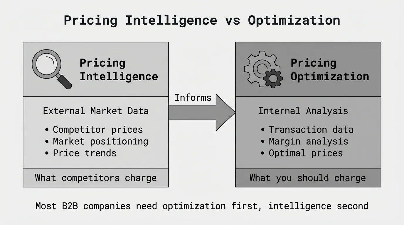For most mid-market distributors and manufacturers, pricing optimization based on internal transaction data delivers 80% of the value at 20% of the cost compared to competitive intelligence software.