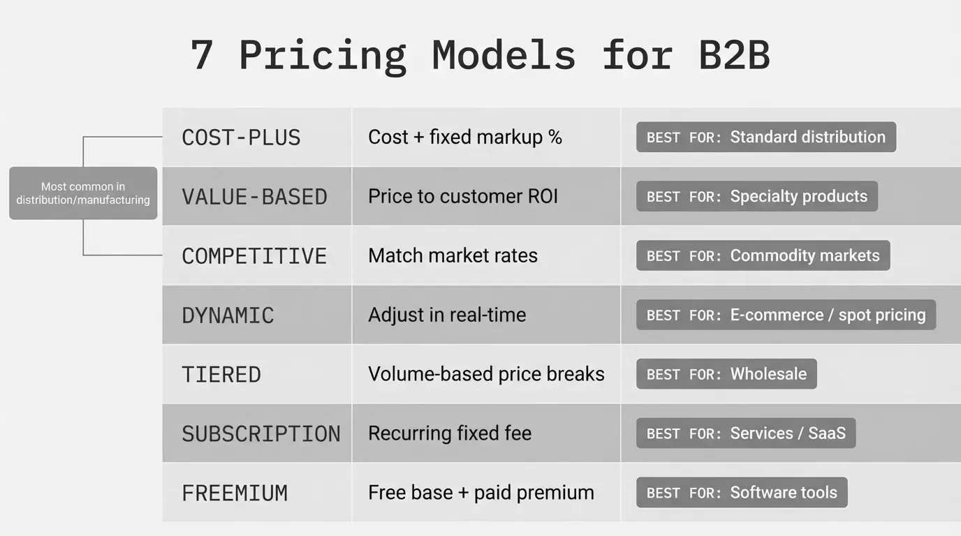The 7 pricing models that matter for distribution and manufacturing. Learn which ones actually work for 5K-100K SKU catalogs and how to pick the right approach.