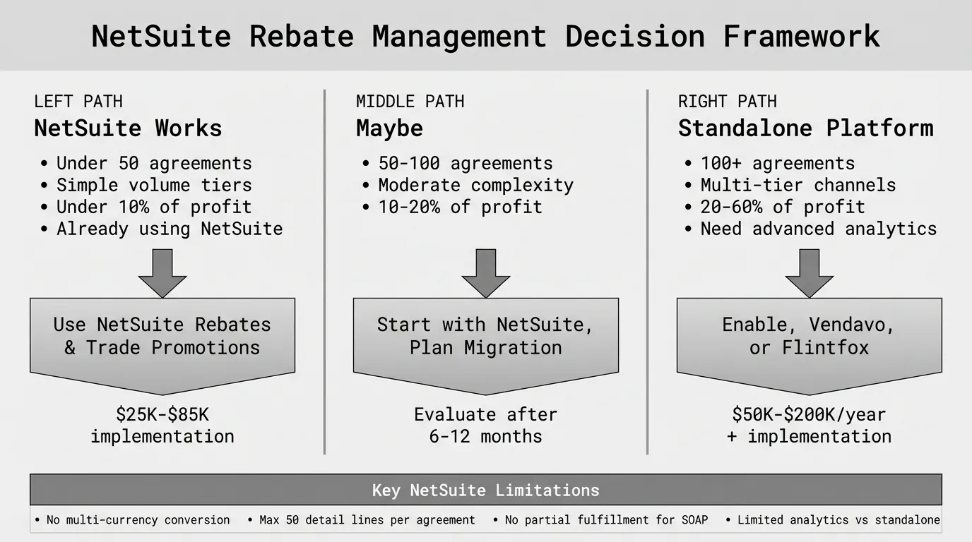 Start with diagnostics. Implement NetSuite rebate management if complexity is moderate. Invest in standalone rebate software once you've confirmed material leakage exists, quantified the recoverable opportunity, and documented rebate terms clearly.