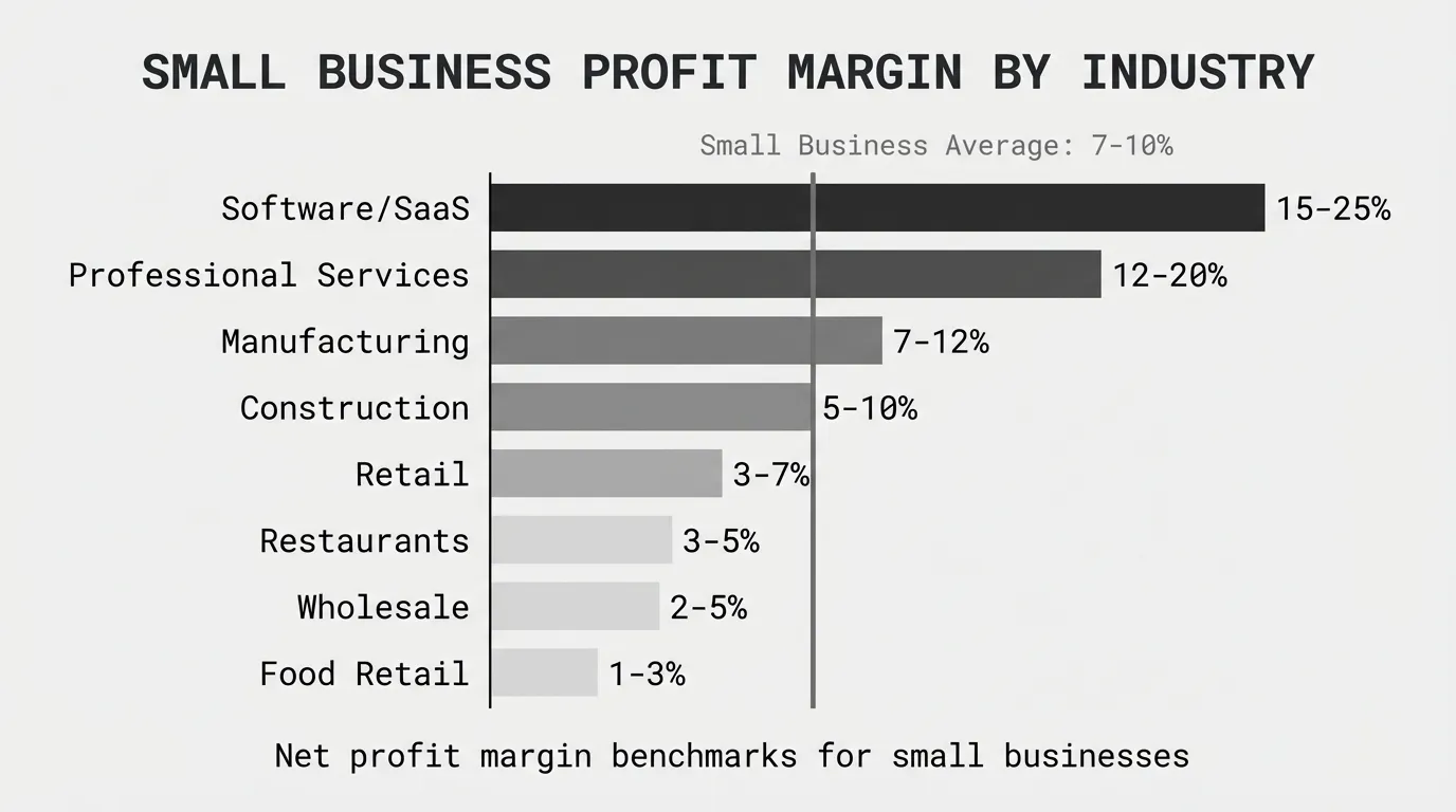Small business profit margins vary dramatically by industry. Professional services average 12% to 20% net profit margin. Retail averages 3% to 7%. Restaurants average 3% to 5%. Manufacturing averages 7% to 12%. Understanding these benchmarks tells you whether your business performs well for your industry.