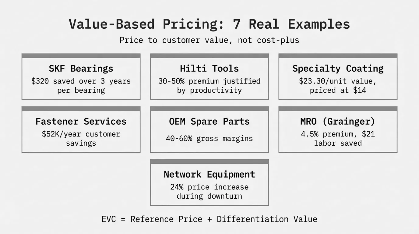 Value-based pricing examples show how B2B companies set prices based on measurable customer outcomes instead of cost-plus markups. A bearing that costs $45 to manufacture but prevents $2,800 in annual downtime can justify a $180 price tag, not the $58.50 that cost-plus math would suggest.