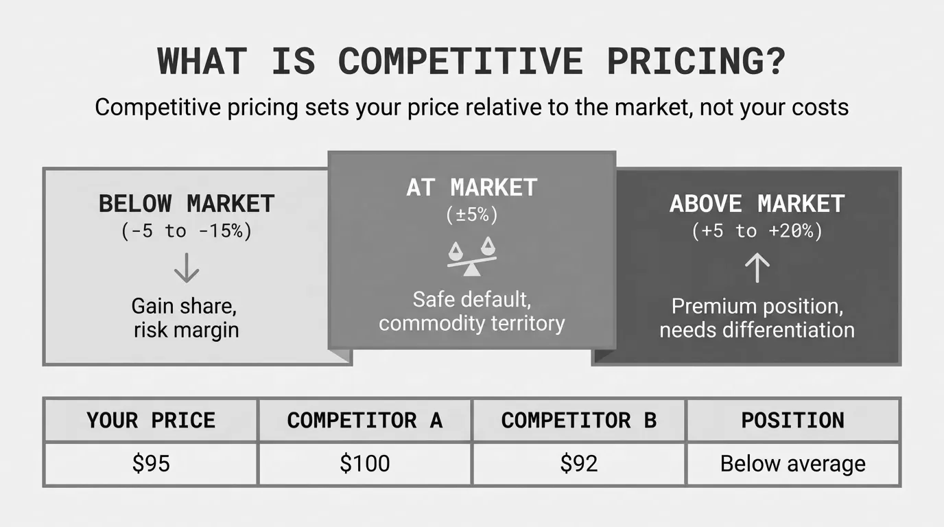 Competitive pricing starts from the market. You anchor to what's already being charged and adjust from there. It's practical and fast, but it lets your competitors' pricing decisions drive yours.