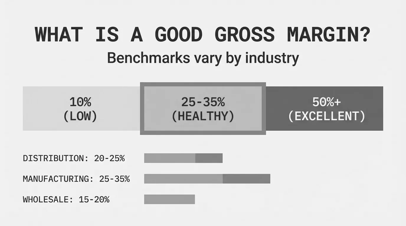 A good gross margin depends entirely on your industry. For wholesale distribution, 20% to 30% is healthy. For manufacturing, 25% to 40% is typical. For software, anything below 70% raises questions.