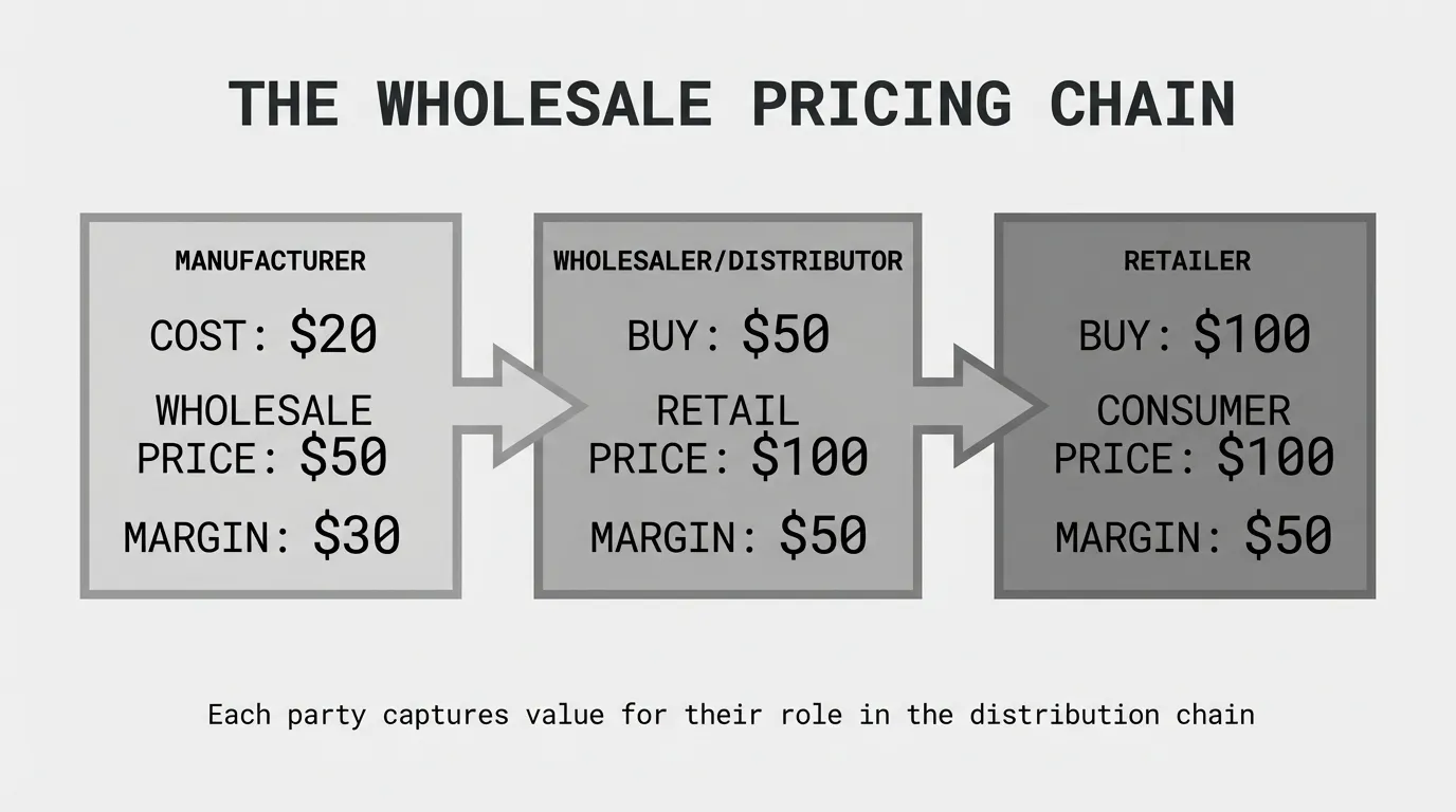 The math is straightforward: wholesalers trade higher profit-per-unit for higher volume-per-sale. Instead of spending marketing dollars to find 100 individual customers, you find one retail partner who buys 100 units at once. Lower price, higher volume, lower customer acquisition costs.