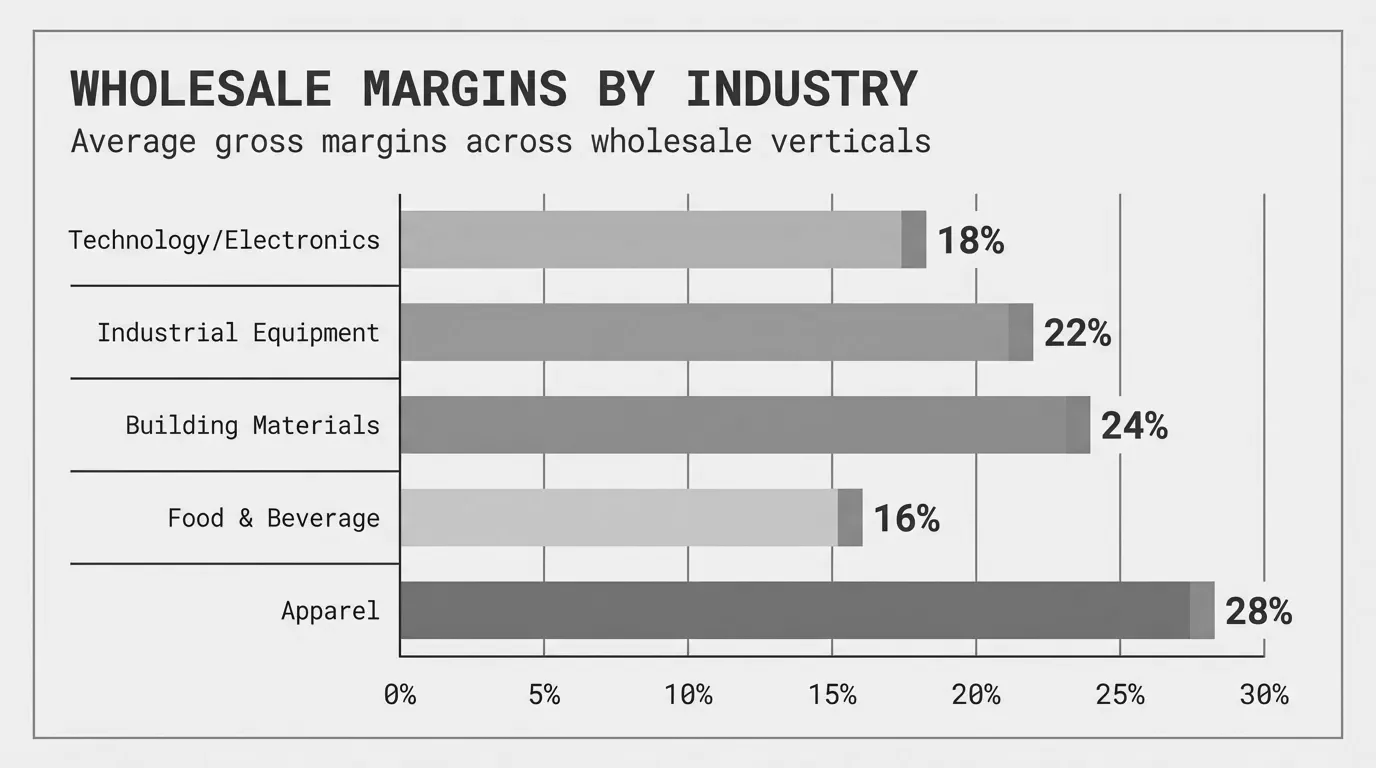 Apparel wholesalers sit at the opposite end of the spectrum. Gross margins of 35-45% are standard, with some specialty segments reaching 50% or higher.