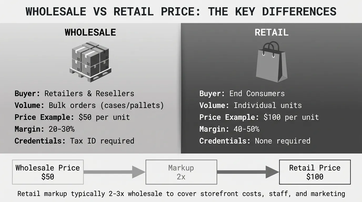 The math is straightforward: retailers purchase at wholesale prices, then mark up to cover their operating costs (rent, staff, marketing) plus profit. Wholesale buyers avoid these costs by purchasing in bulk and leaving consumer sales to retailers. Lower per-unit price, higher volume, no consumer-facing infrastructure.
