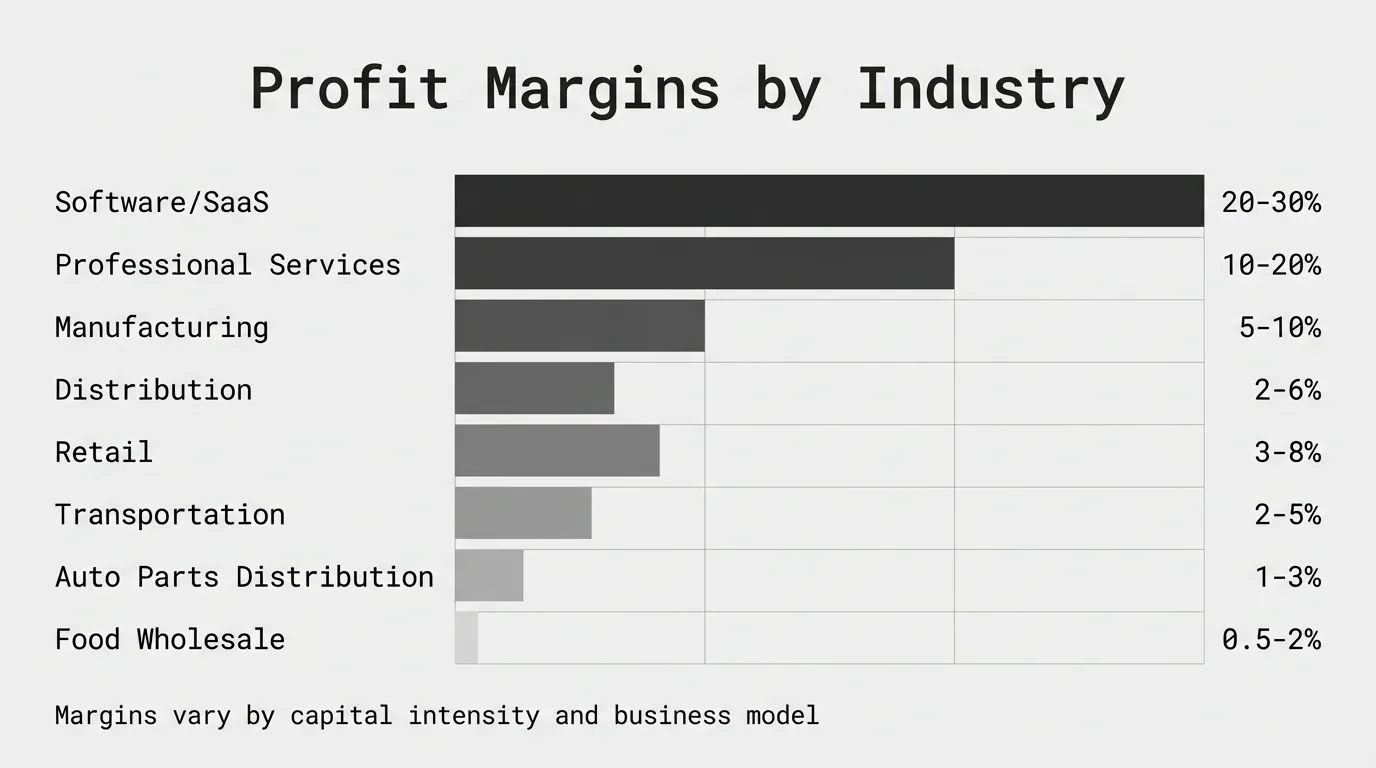 Profit margins by industry vary from 0.5% to 30% depending on business model, capital intensity, and competitive dynamics. Software companies operate at 20-30% net margins. Food wholesalers run on 0.5-2%. Manufacturing averages 5-10%. Distribution averages 2-6%.